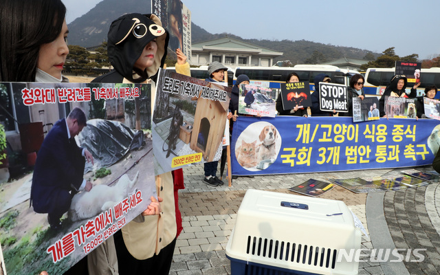 [서울=뉴시스]박영태 기자 = 1500만 반려인 연대 회원들이 19일 청와대 분수대 앞에서 개와 고양이의 식용 종식을 위한 국회 3개 법안 통과 촉구 기자회견을 하고 있다. 2020.01.19.