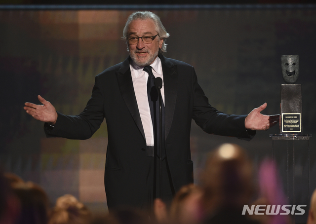 [로스앤젤레스=AP/뉴시스]배우 로버트 드 니로가 19일(현지시간) 미 캘리포니아주 로스앤젤레스의 슈라인 오디토리엄에서 열린 제26회 미배우협회(SAG) 시상식에서 공로상을 받고 소감을 말하고 있다. 2020.01.20.