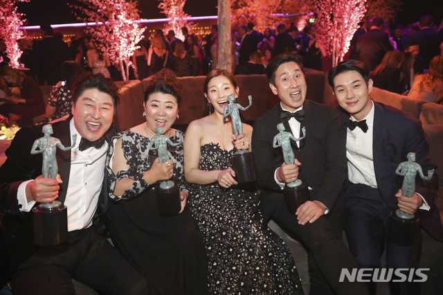 [로스앤젤레스=AP/뉴시스]영화 '기생충' 출연진이 20일(현지시간) 미 캘리포니아주 로스앤젤레스의 슈라인 오디토리엄에서 열린 2020 피플 매거진 미배우협회(SAG) 시상식 뒤풀이에 참석해 트로피를 들고 포즈를 취하고 있다. 왼쪽부터 배우 송강호, 이정은, 박소담, 이선균, 최우식. '기생충'은 아시아 영화 최초로 실질적 작품상에 해당하는 '앙상블상'을 받았으며 이 부문은 영화에 출연한 주연·조연 배우 전체가 상을 받는다. 2020.01.21.