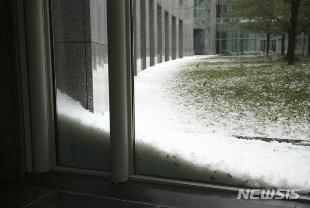 [캔버라(호주)=AP/뉴시스]골프공 크기만한 우박덩어리들이 폭풍과 함께 쏟아진 20일 호주 수도 캔버라의 국회의사당 앞 잔디가 하얀 우박들로 뒤덮혀 있다. 시드니와 멜버른, 캔버라 등 며칠 전까지도 대규모 산불과 건조한 날씨로 고통받던 호주 동남부 지역이 이번엔 자동차를 파손시킬 만큼 큰 우박덩어리들과 많은 비를 쏟아부은 폭풍으로 몸살을 앓고 있다고 호주 언론들이 21일 전했다. 2020.1.21