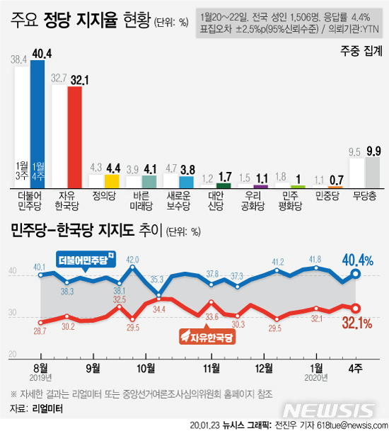 [서울=뉴시스] 여론조사 전문기관 리얼미터는 YTN의 의뢰로 지난 20~22일 실시한 1월4주차 주간집계 결과 민주당 지지도가 40.4%를 기록했다고 23일 밝혔다. 전주 38.4%에서 2.0%포인트 오른 수치다.