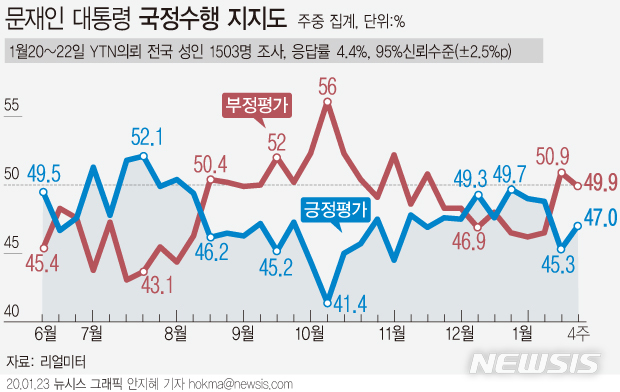 [서울=뉴시스]리얼미터가 20~22일 실시한 1월 4주차 주간집계 결과 문 대통령의 국정수행 지지율이 47%를 기록했다고 23일 밝혔다. 부정평가는 1%포인트 내린 49.9%로 집계됐다. (그래픽=안지혜 기자) [email protected]