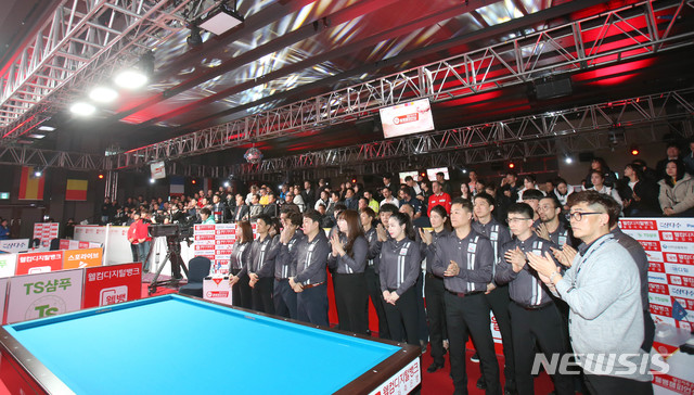 [서울=뉴시스] 박민석 기자 = 23일 오후 경기 고양시의 한 호텔에서 열린 PBA투어 7차전 '웰컴저축은행 웰뱅 PBA-LPBA 챔피언십 대회' 개막식에서 참석자들이 박수를 치고 있다. (사진=PGA투어 제공) 2020.01.23.