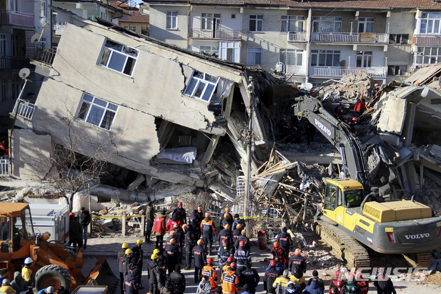 [엘라지(터키)=AP/뉴시스]24일(현지시간) 터키 동부 엘라지 인근에서 규모 6.5의 지진이 발생한 후 구조대원들이 25일 무너진 건물에서 수색을 이어가고 있다. 터키 당국은 이 지진으로 최소 21명이 숨지고 500명 이상이 다쳤으며 30여 명이 무너진 건물에 깔렸다고 밝혔다. 2020.01.25.