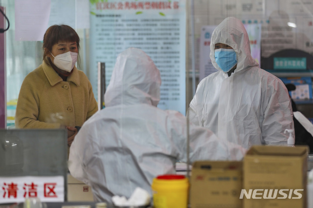 [우한=AP/뉴시스] 중국 우한의 한 보건소에서 27일 환자로 보이는 한 여성과 의료진이 나란히 서있다. 2020.01.28