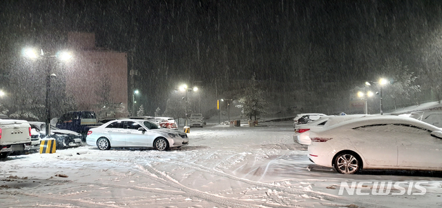 [태백=뉴시스] 김경목 기자 = 대설주의보가 발효 중인 강원 태백시에 28일 오전 눈이 내리면서 주차장에 쌓이고 있다. 2020.01.28. (사진=독자 제공)