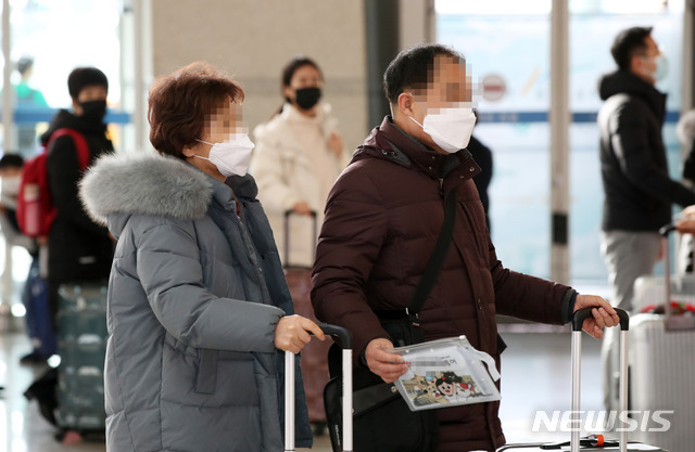 [인천공항=뉴시스] 고범준 기자 = 우한 폐렴(신종 코로나바이러스 감염증)이 빠르게 확산하고 있는 가운데 29일 오전 인천국제공항 제1여객터미널에서 관광객들이 마스크를 쓰고 이동하고 있다. 2020.01.29.