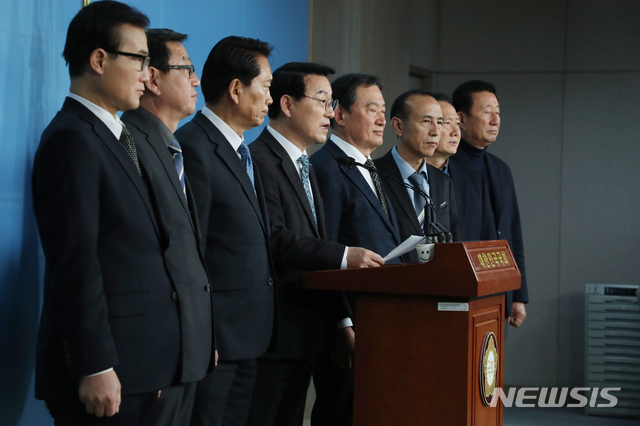 [서울=뉴시스]김명원 기자 = 손학규 대표를 지지하는 바른미래당 지역위원장들이 29일 오전 서울 여의도 국회 정론관에서 기자회견을 하고 있다. 2020.01.29.