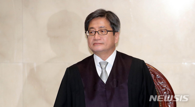[서울=뉴시스]김선웅 기자 = 김명수 대법원장이 30일 오후 서울 서초구 대법원에서 '문화계 블랙리스트' 사건 김기춘 전 대통령비서실장 외 6명에 대한 항소심 선고 공판을 하기 위해 착석하고 있다. 2020.01.30.