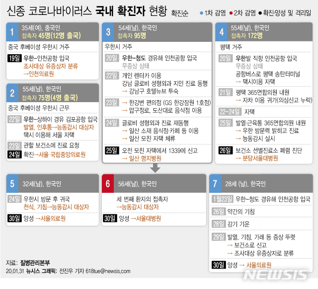 [서울=뉴시스] 31일 질병관리본부에 따르면 7번째 신종 코로나바이러스 감염증(우한 폐렴) 확진 환자는 28세 한국인 남성으로 중국 우한에서 청도를 거쳐 23일 오후 10시20분 청도항공 QW9901편을 통해 인천공항으로 입국했다고 밝혔다. (그래픽=전진우 기자)