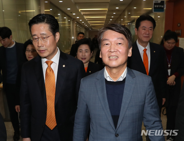 [서울=뉴시스] 고승민 기자 = 안철수 전 바른미래당 의원이 4일 서울 여의도 국회에서 '일하는 국회 개혁방안'을 발표한 뒤 주황색 넥타이와 티셔츠를 착용한 이태규, 이동섭, 신용현 의원과 국회를 나서고 있다. 2020.02.04.