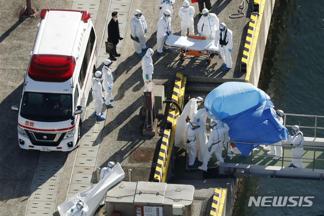 [요코하마=AP/뉴시스]5일 일본 도쿄 남쪽 요코하마항에 정박한 유람선 다이아몬드 프린세스호에서 방호복을 입은 의료진이 신종 코로나바이러스 감염증(우한 폐렴) 양성 판정을 받은 승객들을 구급차로 인도하고 있다. 일본 정부는 다이아몬드 프린세스호에서 10명의 감염자가 나왔다고 밝혔으며 배에 타고 있는 3700명은 일본 법에 따라 최대 14일간 격리될 것이라고 말했다. 2020.02.05.