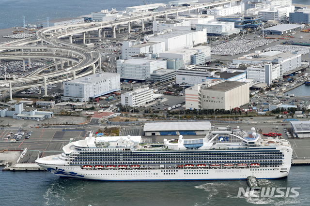 [요코하마=AP/뉴시스]6일 일본 도쿄 남쪽 요코하마 항구에 유람선 다이아몬드 프린세스호가 물자 보충을 위해 정박하고 있다. 일본 보건성 관계자는 이 유람선에서 또다시 10명의 신종 코로나바이러스 감염증(우한 폐렴) 확진자가 나왔다고 밝혀 지금까지 확진자는 20명으로 늘어났다. 추가 확진을 받은 10명은 인근 병원으로 옮겨져 추가 검사와 치료를 받을 예정이다. 2020.02.06.