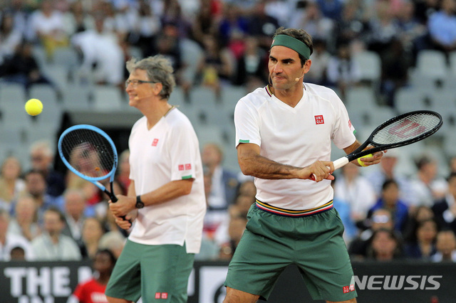 [케이프타운(남아공)=AP/뉴시스]로저 페더러(오른쪽)와 마이크로소프트 창업자 빌 게이츠가 7일(현지시간) 남아공 케이프타운의 케이프타운 스타디움에서 열린 '로저 페더러 테니스 자선 경기'에 참가해 라파엘 나달과 남아공 출신 코미디언 트레버 노아 조와 경기하고 있다. 이 경기는 페더러 조가 나달 조에 6-3으로 승리했다. '로저 페더러 재단' 기금 마련을 위해 열린 이 자선 경기는 이들의 복식 경기와 페더러-나달의 단식 3세트 경기로 치러졌다. 2020.02.08.