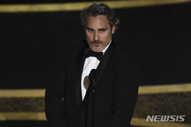 [로스앤젤레스=AP/뉴시스]배우 호아킨 피닉스가 9일(현지시간) 미 캘리포니아주 로스앤젤레스의 돌비 극장에서 열리고 있는 제92회 아카데미 시상식에서 영화 '조커'로 남우주연상을 받고 소감을 말하고 있다. 2020.02.10.