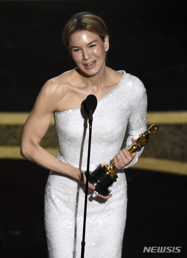 [로스앤젤레스=AP/뉴시스]배우 르네 젤위거가 9일(현지시간) 미 캘리포니아주 로스앤젤레스의 돌비 극장에서 열리고 있는 제92회 아카데미 시상식에서 영화 '주디'로 여우주연상을 받고 소감을 말하고 있다. 2020.02.10.