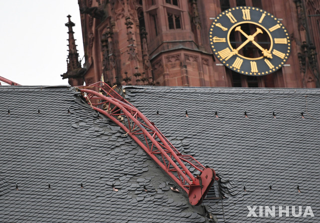 [프랑크푸르트=AP/뉴시스]10일(현지시간) 유럽을 덮친 겨울 태풍 시애라의 여파로 독일 프랑크푸르트의 프랑크푸르트 성당 지붕이 쓰러진 크레인으로 파손돼 있다. 독일 전역을 휩쓴 시애라로 이틀간 도로, 철도, 항공 등 교통에 심각한 지장을 초래했으며 유럽에서 최소 6명이 사망했다. 2020.02.11.