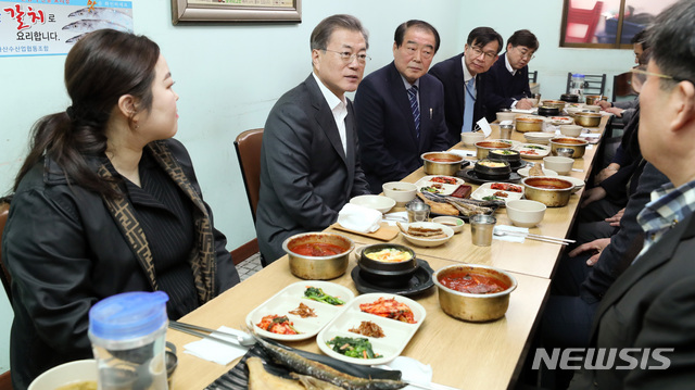 [서울=뉴시스]박영태 기자 = 문재인 대통령이 신종 코로나 바이러스 감염증(COVID-19)으로 위축된 내수경제 활성화를 위해 12일 서울 남대문시장을 방문해 시장 상인들과 오찬을 하며 이야기를 나누고 있다. 2020.02.12.