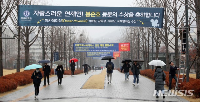 [서울=뉴시스]김선웅 기자 = 11일 서울 서대문구 연세대학교에 영화감독 봉준호(사회학과 88학번)의 작품 '기생충'의 오스카상 4개 부문 수상을 축하하는 현수막이 걸려 있다. 2020.02.12.