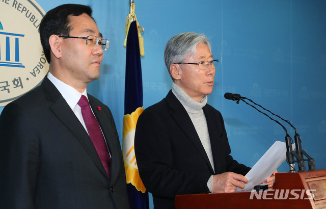 [서울=뉴시스] 장세영 기자 = 자유한국당 여상규(오른쪽) 법사위원장과 주호영 의원이 13일 서울 여의도 국회 정론관에서 기자회견을 열고 민주당의 판사출신 영입에 대한 공개질의를 하고 있다. 2020.02.13.