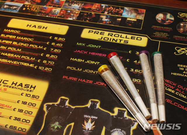 [엄스테르담=AP/뉴시스] 네덜란드 암스테르담 시장인 펨케 할세마는 13일(현지시간) 시의원에 서한을 보내고 더이상 커피숍에서 외국인에 대마초를 판매할 수 없도록 하는 규정을 만들 것을 제안했다. 사진은 암스테르담의 커피숍에서 판매 중인 대마초와 메뉴판. 2020.2.14.