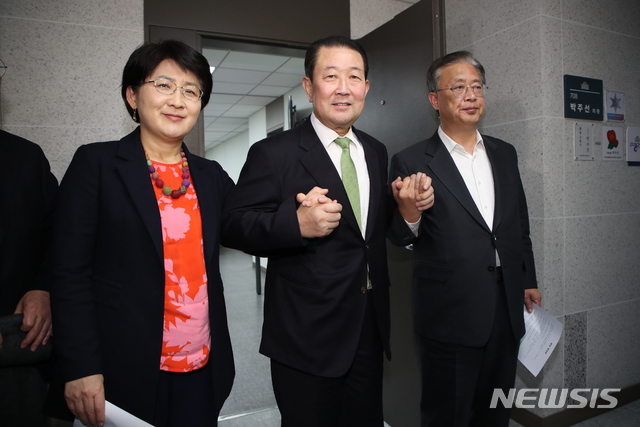 [서울=뉴시스] 김진아 기자 = 박주선 바른미래당 대통합개혁위원장, 박주현 민주평화당 통합추진특별위원장, 유성엽 대안신당 통합추진위원장이 12일 서울 여의도 국회 의원화관에서 합당 합의문에 서명 후 손을 맞잡고 있다. 2020.02.14.