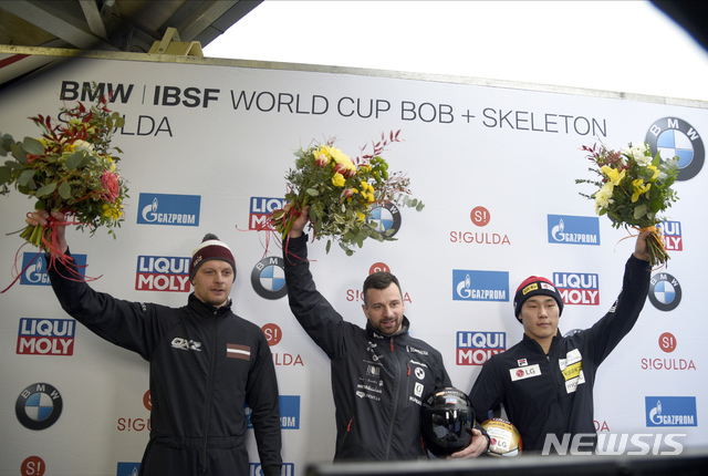 [시굴다(라트비아)=AP/뉴시스]윤성빈(오른쪽)이 15일(현지시간) 라트비아 시굴다에서 열린 2019-2020 국제봅슬레이스켈레톤연맹(IBSF) 월드컵 8차 남자 스켈레톤에서 동메달을 따내고 시상대에 올라 포즈를 취하고 있다. 윤성빈은 1·2차시기 합계 1분41초15로 3위를 기록해 동메달을 차지해 이번 시즌 총 5개의 월드컵 메달(금1 은2 동2)을 획득했다. 2020.02.16.
