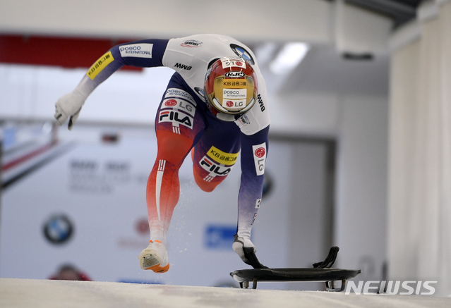 [시굴다(라트비아)=AP/뉴시스]윤성빈이 15일(현지시간) 라트비아 시굴다에서 열린 2019-2020 국제봅슬레이스켈레톤연맹(IBSF) 월드컵 8차 남자 스켈레톤에 출전해 출발하고 있다. 윤성빈은 1·2차시기 합계 1분41초15로 3위를 기록해 동메달을 차지해 이번 시즌 총 5개의 월드컵 메달(금1 은2 동2)을 획득했다. 2020.02.16.