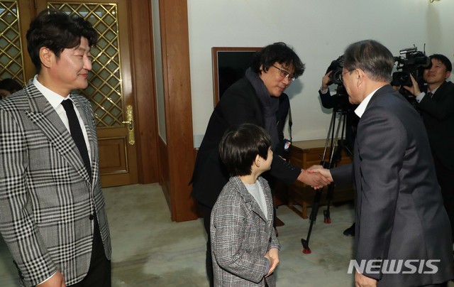 [서울=뉴시스]박영태 기자 = 문재인 대통령이 20일 청와대 본관에서 열린 아카데미 영화상 4관왕에 빛나는 ‘기생충’ 봉준호 감독을 비롯한 제작진 및 출연진 격려 오찬 사전환담에 참석하며 봉준호 감독과 악수하고 있다. 2020.02.20.