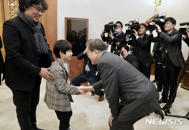 [서울=뉴시스]박영태 기자 = 문재인 대통령이 20일 청와대 본관에서 아카데미 영화상 4관왕에 빛나는 ‘기생충’ 제작진 및 출연진 격려 오찬 사전환담에 참석해 아역배우 정현준 군과 악수하고 있다. 왼쪽은 봉준호 감독. 2020.02.20.