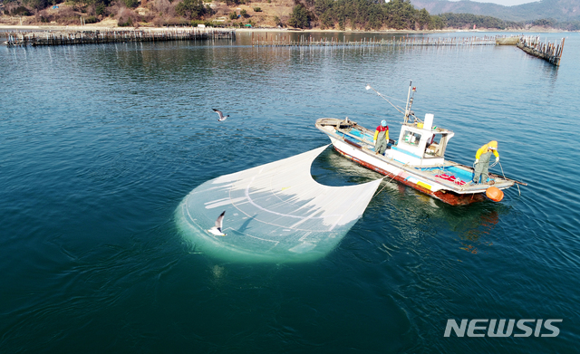 [남해=뉴시스]차용현 기자 = 지난 20일 오후 경남 남해군 삼동면 인근 지족해협에서 낙하산 모양의 물돛을 설치한 어선이 개불을 잡고 있다. 지족해협의 개불잡이는 물돛을 이용해 조류를 따라 흐르며 반대편 수중 바닥에 설치한 갈고리를 끌어 개불을 잡는 것이 특징이다. 2020.02.21.