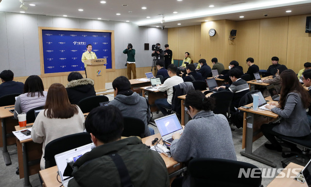[서울=뉴시스] 고범준 기자 = 박원순 서울시장이 21일 오전 서울 중구 서울시청에서 신종 코로나바이러스 감염증(코로나19) 관련 광화문광장 집회 금지 등에 대해 발표를 하고 있다. 2020.02.21.