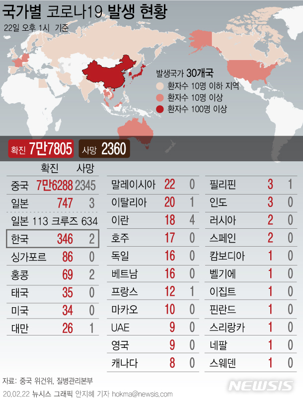 [그래픽]코로나19 국내외 확진 현황…中 7만6288명
