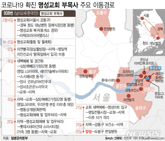 [서울=뉴시스]26일 서울 강동구에 따르면 코로나19 확진 판정을 받은 명성교회 부목사(52세·남)는 감염 시점으로 추정되는 14일부터 일주일간 교회 예배당, 사무실, 교인 가정 등에 방문했다. (그래픽=전진우 기자)