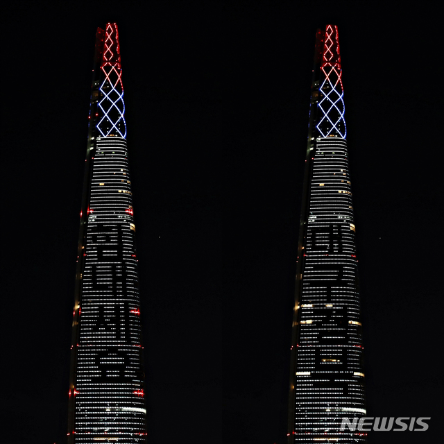 [서울=뉴시스]롯데월드타워가 질병관리본부와 함께 ‘코로나19(COVID-19)’ 극복을 위한 대국민 응원 메시지로 빛을 밝힌다. 이번 점등은 27일부터 타워 건물 외벽에 ‘코로나19’로 힘든 대구·경북 지역 포함 대한민국 국민들에게 응원의 메시지를 전달하기 위해 기획했다.
