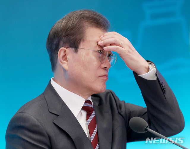 [서울=뉴시스]배훈식 기자 = 문재인 대통령이 27일 청와대 영빈관에서 열린 국토교통부와 해양수산부 업무보고에 참석해 김현미 국토부 장관의 업무보고를 받으며 이마를 긁적이고 있다. 2020.02.27.