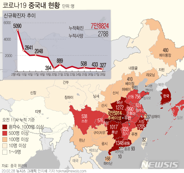[그래픽]코로나19 중국 추가 사망자 44명·확진자 327명….확진자 총7만8824명