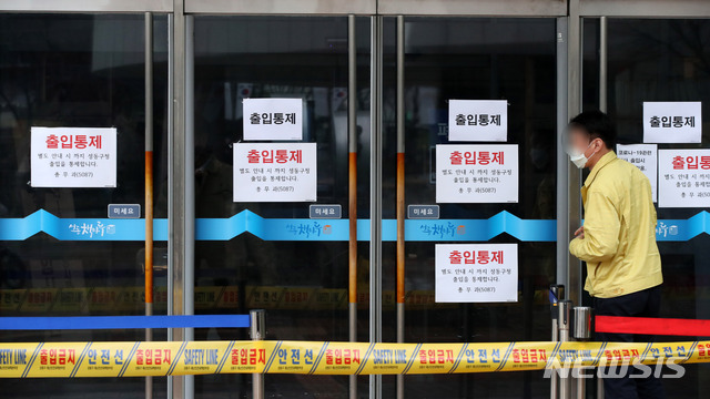[서울=뉴시스] 고범준 기자 = 성동구청 직원이 신종 코로나바이러스 감염증(코로나19) 확진판정을 받아 구청사가 폐쇄된 28일 오후 서울 성동구 성동구청에 출입통제를 알리는 안내문이 붙어 있다. 이 직원은 명성교회(강동구) 부목사와 같은 아파트 거주민이다. 2020.02.28.