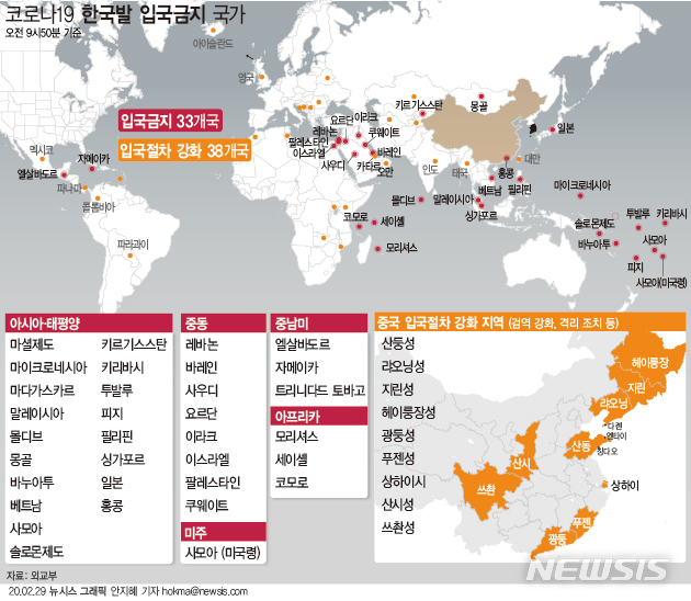 [서울=뉴시스] 29일 외교부 등에 따르면 이날 오전 9시50분 기준 한국 출발 여행객에게 입국 금지 조치를 내리거나 입국 절차를 강화한 국가는 총 71곳으로 집계됐다. 전날보다 9곳 늘어난 수치다. (그래픽=안지혜 기자) [email protected]