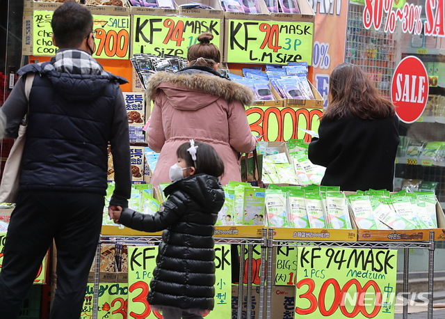 [서울=뉴시스]박주성 기자 = 신종 코로나바이러스 감염증(코로나19) 확진환자가 추가발생하고 있는 가운데 1일 오후 서울 중구 명동의 한 할인마트에서 관광객들이 마스크를 구입하고 있다. 2020.03.01.