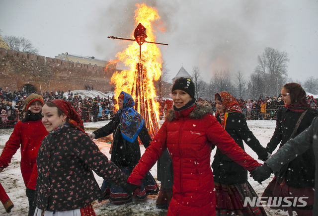 [벨리키노브고로드=AP/뉴시스]1일(현지시간) 러시아 수도 모스크바 북동쪽 약 550km 떨어진 벨리키 노브고로드에서 마슬레니차 축제가 열려 참가자들이 마슬레니차 허수아비를 태우며 춤추고 있다. 러시아 대표축제 마슬레니차는 사순절 직전 일주일 동안 열리는 전통 봄맞이 축제로 매년 2월 말에서 3월 초 사이 월요일에 시작해 일요일까지 열린다. 2020.03.02.