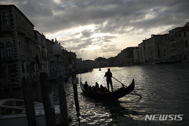 [베네치아=AP/뉴시스]3일(현지시간) 이탈리아 베네치아의 대수로 주변에서 한 곤돌라 뱃사공이 승객을 태우고 노를 젓고 있다. 이탈리아 보건당국은 3일 오후 6시 기준 신종 코로나바이러스 감염증 누적 확진자 수가 전날 대비 466명 증가해 2천502명, 사망자 수는 27명 증가한 79명으로 잠정 집계됐다고 밝혔다. 이탈리아의 사망자 수는 중국(2천943명) 이외의 국가 중 가장 많은 숫자다. 2020.03.04.
