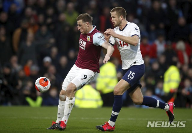 [번리=AP/뉴시스]토트넘의 에릭 다이어가 7일(현지시간) 영국 번리의 터프무어에서 2019-20시즌 잉글리시 프리미어리그(EPL) 29라운드 번리의 크리스 우드와 공을 다투고 있다. 토트넘은 번리와 1-1로 비기며 5경기째 승리를  올리지 못했으며 승점 41로 8위를 기록하고 있다. 2020.03.08.