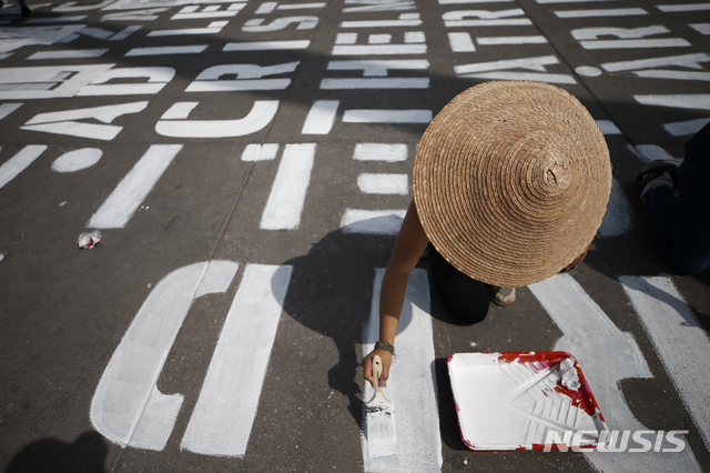 [멕시코시티=AP/뉴시스]세계 여성의 날인 8일(현지시간) 멕시코 수도 멕시코시티의 소칼로 광장 바닥에서 한 여성이 3000명이 넘는 여성 폭력 희생자의 이름을 쓰는 시위에 동참하고 있다. 최근 멕시코에서 여성과 소녀들에 대한 살인이 증가하면서 성폭력에 대한 항의 시위가 거세지고 있다. 2020.03.09.