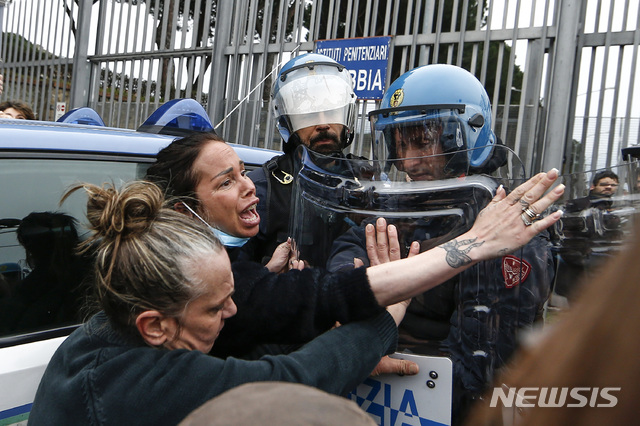 [로마=AP/뉴시스]9일(현지시간) 이탈리아 로마의 레비비아 교도소 수감자들이 정부의 신종 코로나바이러스 감염증(코로나19) 억제 조치에 반대하는 시위를 벌인 후, 수감자 가족들이 경찰과 대치하고 있다. 이탈리아 북부 모데나 교도소에서는 코로나19 확산 방지를 위한 면회 금지 조치에 항의하는 폭동이 발생, 수감자 6명이 의무실에 침입해 메타돈 과다 복용으로 사망했다고 교도소 측이 밝혔다. 이탈리아 정부는 코로나19의 급속한 확산을 막기 위해 8일부터 북부 지역을 봉쇄했다. 2020.03.10.