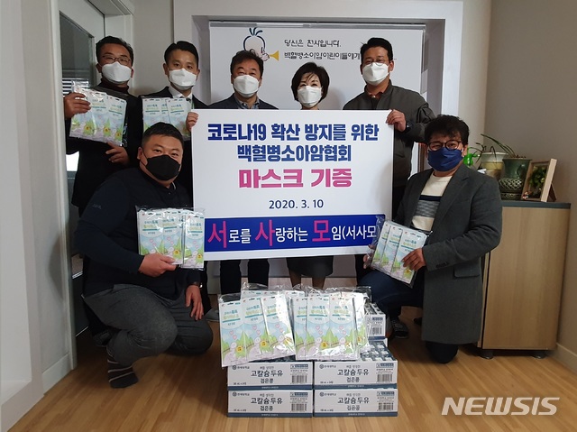 [천안=뉴시스]이종익 기자 = 충남 천안지역에서 무료급식 자원봉사 등을 펼치고 있는 서사모(서로를 사랑하는 모임)와 ㈜금강웰빙푸드는 10일 (사)한국백혈병소아암협회 충청지회를 방문해 소아암어린이들을 위한 어린이용 황사 마스크 500매와 두유 10상자를 전달했다. 2020.03.10.