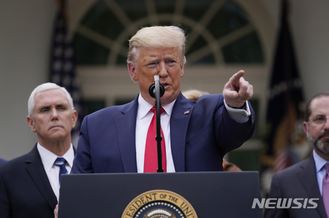 [워싱턴=AP/뉴시스]도널드 트럼프 미국 대통령이 13일(현지시간) 백악관 로즈가든에서 신종 코로나바이러스 감염증(코로나19) 관련 긴급 기자회견을 하고 있다. 트럼프 대통령은 이 자리에서 코로나19 확산을 막기 위해 국가 비상사태를 선언했다. 그는 "국가 비상사태를 공식 선언한다"면서 "이번 선언으로 주와 지방정부가 코로나19 대응을 위해 500억 달러(약 61조 원)를 이용할 수 있을 것"이라고 말했다. 2020.03.14.