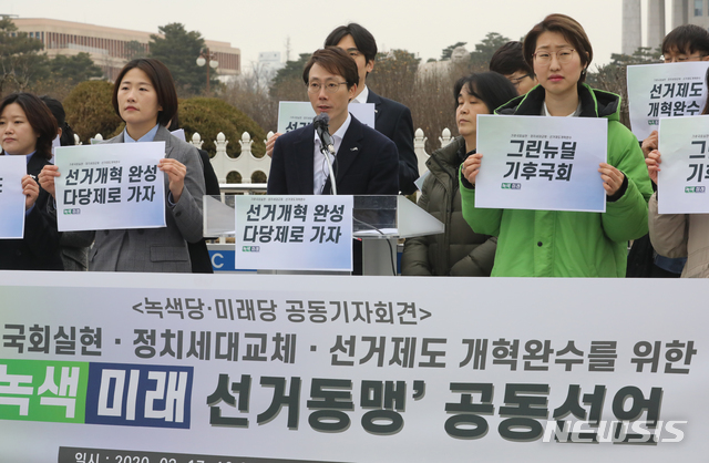 [서울=뉴시스]김명원 기자 = 오태양 미래당 공동대표가 17일 오전 서울 여의도 국회 정문 앞에서 열린 녹색당·미래당 선거연합참여 공동기자회견에서 발언하고 있다. 2020.03.17.