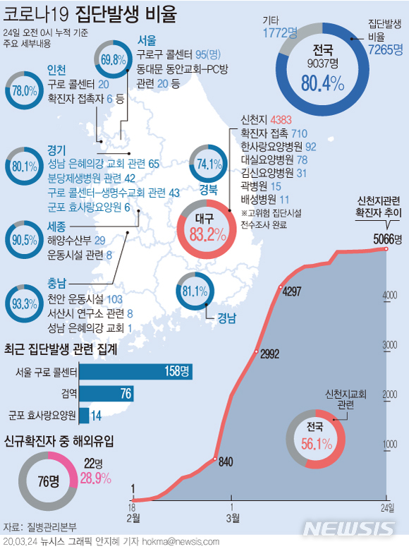 [서울=뉴시스]24일 질병관리본부에 따르면 이날 오전 0시 기준 코로나19 확진자의 80.4%가 집단발생과 연관이 있는 것으로 파악됐다. 신규 확진자 76명으로, 이 가운데 22명(28.9%)이 해외유입 사례다. (그래픽=안지혜 기자)