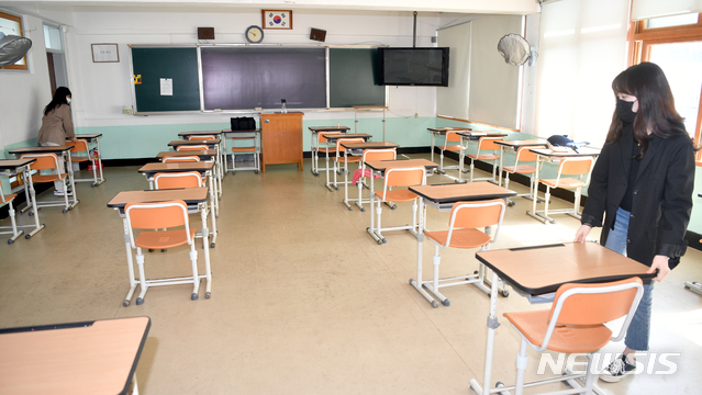 [광주=뉴시스] 류형근 기자 = 신종 코로나 바이러스 감염증(코로나19) 확산으로 초·중·고 개학이 연기된 가운데 24일 오전 광주 동구 조선대학교여자고등학교에서 교사들이 '사회적 거리두기' 일환으로 학생들의 책상을 벌리고 있다. 학교 측은 학생들의 건강 관리를 위해 각 교실에 체온계와 소독용품까지 비치했다. 2020.03.24